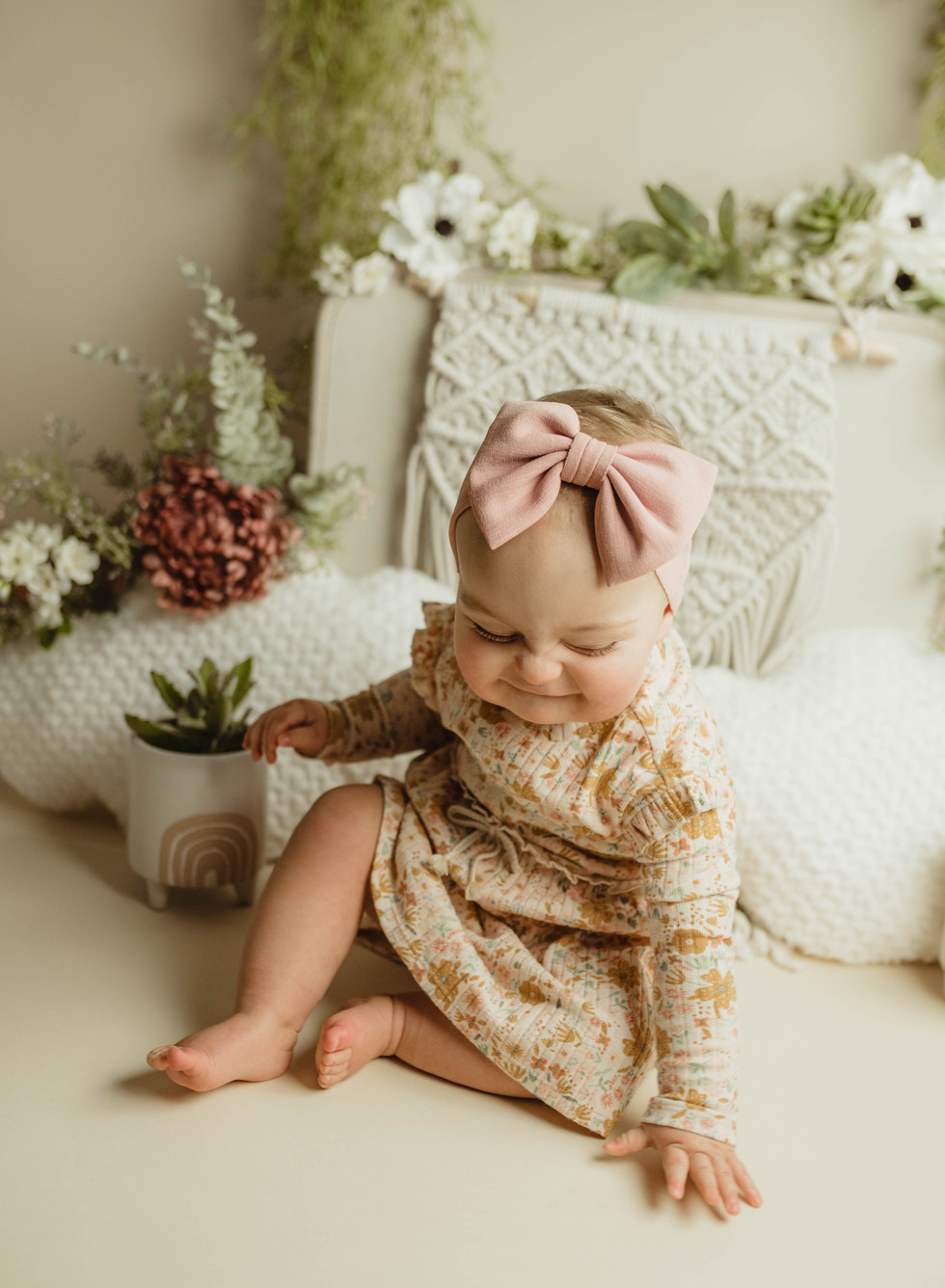 Look at the sweet smile! Gracelyn really is a ball of sunshine, so it makes sense that her parents wanted a boho, sunshine theme for her one year cake smash. How fitting that it would be the cloudiest day, complete with a rain/snow mix.